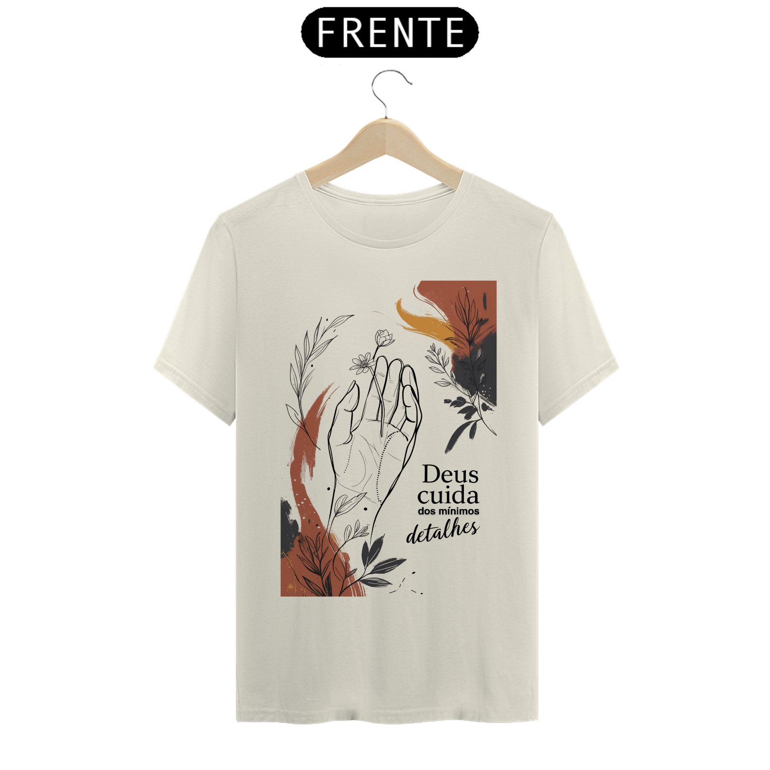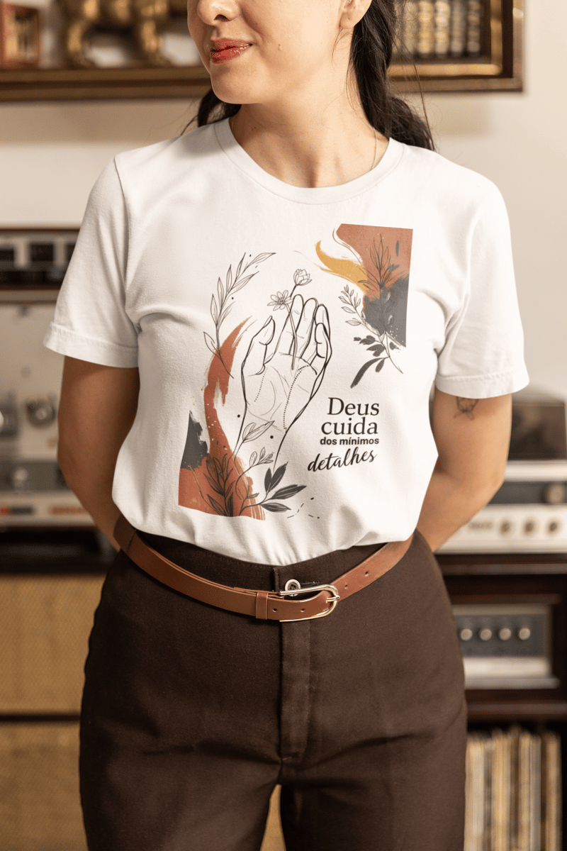 A camiseta “Deus cuida dos mínimos detalhes” é um lembrete suave de que, mesmo nos detalhes mais simples da vida, Deus está presente, atento e amoroso.