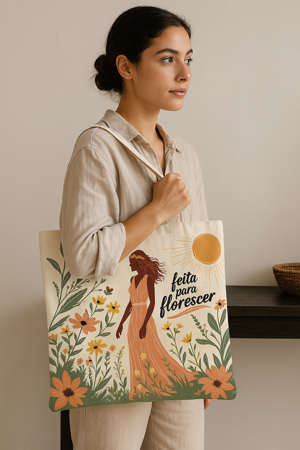 A ecobag “Feita para florescer” é uma declaração silenciosa, porém poderosa, de quem escolheu crescer em Deus, mesmo em tempos difíceis.